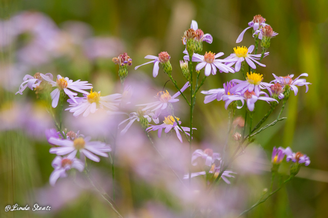 Summer has begun its wind-down. The daylight hours are dwindling, the sun is lower in the sky, the leaves are drying, and some of the birds have already begun their journeys elsewhere. Our colors are starting their change to the deep reds and oranges of fall. So I set out in search of a “last” color of summer and found these Lindley’s asters blooming with their final hurrah, valiantly reaching up to the sun’s warmth. With our lowering night-time temperatures they too will soon be fading into fall’s colors.