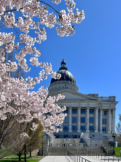 The Utah State Capitol is surrounded by 433 Yoshino cherry trees, all of which were at peak bloom while we were there. The current trees were planted in 2008, although the first cherry trees were planted on Arbor Day in 1931. The trees are on either side of a walkway that circles the capitol building. On the day we were there the walkway was filled with smiling people taking in the beauty and the smells of spring. There were people sharing picnics on the lawn, as well as people having their photos taken under the trees – including many college and high school graduates in their graduation robes. A slow meander around the capitol was a perfect chance to revel in the promise of spring and it’s beauty.