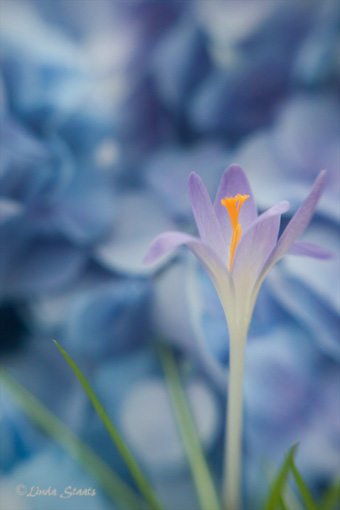 My earlier spring photographs have been bright and full of color. But today’s photo is more of a pastel, with shades of blue and purple. I was at the spring flower show at the Marjorie McNeely Conservatory today. And just as cloudy and gray as the skies were outside, the flower show was full of colors – blues, pinks, reds, and greens. It was a wonderful sight and yet the colors were almost too many and too much. My eye was drawn to this lovely crocus that was stretching skyward and set off by the blue hydrangea behind it. The subtlety of the colors was wonderful and the bit of orange that the crocus threw skyward was the perfect accent color. The blues reminded me of the bluest of skies that we can get after a spring rain as well as the lovely blue lakes that grace the landscape here in Minnesota. So I’m now adding pastels to my palette of colors of springtime.