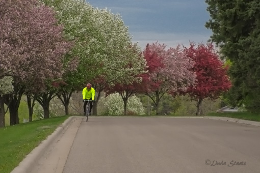 This year we are planning to do the Bike Across Kansas (BAK), a seven-day, 475 mile ride from the western border with Colorado to the eastern border with Missouri. It’s a great adventure filled with the beauty of the Kansas plains, the hospitality of the small towns that we stay in, and the camaraderie of 800 fellow cyclists. We are now in serious training mode. We headed out on our bicycles yesterday morning with chilly temperatures in the 40’s and overcast skies, hoping to get a ride in before the promised rains that were on their way. As is common in spring-time in the upper midwest, the weather can change at any time (and usually does). The skies were gray and dark to the north, but occasionally the sun would peek out long enough to give us a bit of warmth. Unlike our fellow-cyclists living south of Minnesota who are now logging rides of 50 miles and more, we are just unthawing from our winter weather. Our ride yesterday gave us the chance to test multiples layers of clothing along with full-fingered riding gloves to keep warm. Eventually we will pare down to single layers and cycling shorts but that time is still ahead of us. Yesterday’s ride was filled with the scent of blooming lilacs and the spring-time colors of the ornamental trees. All this, including the rain holding off until the afternoon, made our ride a delight and a joy.