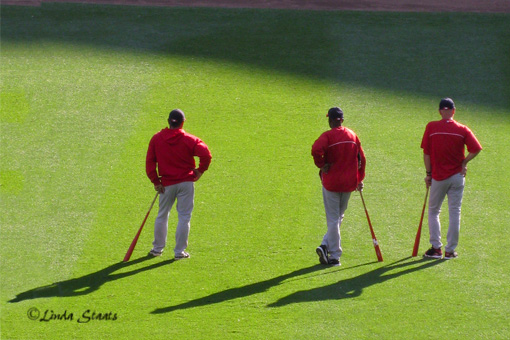 On a beautiful late-spring afternoon I was lucky enough to have tickets to the Minnesota Twins baseball game against the LA Angels. Even better was that I got to go early to see the Twins’ batting practice. The sun was warm, the sky was blue, and our hopes were up for a win that night. After the Twins’ batting practice was over the Angels came out for their warm up. As the sun was moving lower into the sky it created dark shadows from the stadium deck that stretched across the outfield. For awhile it seemed most of the action was anywhere but in left field, as these three players seemed quite content to rest on their bats, soak up the sun, and cast long shadows over the green turf. In the end, the Angels beat the Twins. But I’ve learned that baseball isn’t just about wins and losses – it had been a beautiful afternoon and night for a baseball game.