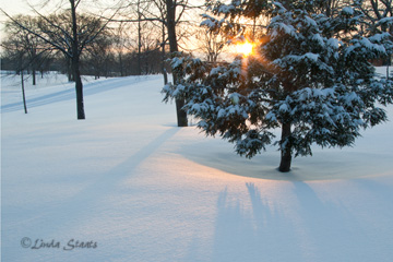 There is a wondrous simplicity that seems to take hold of the landscape in winter. With all the snow that has fallen, our world has become very black and white. Color is hard to find in the surroundings. With a fresh few inches of snow this past week, I headed out of the house with my camera before dawn. I didn’t have to venture very far — just over to a nearby golf course. The world was quiet on this winter’s day; there were no birds, animals, or other people when I got to my destination. The silence was only interrupted by the sounds of my snowshoes. Quickly the sun moved over the horizon and into the sky adding some color to the scene. Doing so it lent its warm light to the cold landscape, with long shadows over the clean snow. As if on cue, the rest of the world began to stir and wake. I heard a cross-country skier out on the groomed tracks, and I heard cars moving by with their tires scrunching the compact snow on the roads. The quiet and stillness had changed, but the simplicity of snow and trees and sunlight was still there.