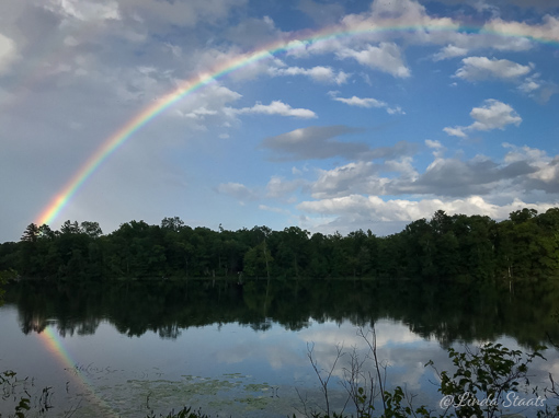 The storm brought wind, rain, and hail and it seemed to stop as quickly as it started. This had been the third or fourth storm to roll through in as many days. But as the dark clouds moved further east and the skies began to clear, there was a brilliant rainbow that arced across the sky and was reflected in the still lake surface below. This was our “reward” for getting through the storms, and with all the uncertainties that are in our day-to-day lives this was truly the brighter side.