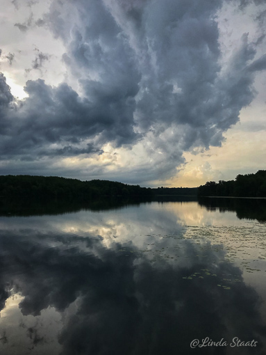 There are so many unknowns with an approaching storm – will it be just rain, will it pass by quickly or stall overhead, will it create damage anywhere in its path, will it build and get worse or will it dissipate, and when will it be overhead. I find the anticipation before a storm moves through fascinating and beautiful. This storm was building for about a half-hour. The white thunderclouds at the far end of the lake stayed to the south as the darker clouds rolled over the lake. The wind quieted and the air was eerie with the stillness. Within ten minutes the rain started, big drops at first and then a downpour. And after another ten minutes the storm had moved out of the area, this time leaving only rain.