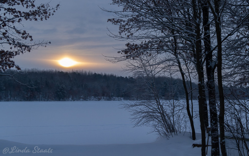 The snow had started to fall at sunset the previous day and continued all night. The morning dawned quiet and lovely with the fresh snow blanketing the landscape. The clouds had remained thick and then there was a brief opening, long enough for the sun to penetrate the cloud cover with its hazy rays for less than a minute. The sun disappeared behind the clouds, the snow began again, and this brief scene was the only sunshine for the day.