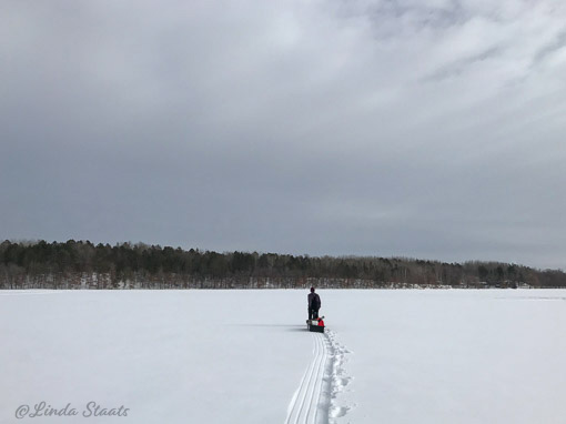 We’d finished our “work” for the day and it was mid-afternoon on an unseasonably balmy day for the North with a temperature of 34 degrees. We loaded up the sled with our ice fishing equipment and headed out across the lake. Leaving a trail behind us, we settled near the middle of the lake, set up our portable fish house and settled in for some comfortable fishing. With protection from the wind, we fished for a couple of hours coming back with crappies, sunfish, and one Northern pike. We packed up after dusk and were beckoned back to the cabin with its warm lights. It was a delightful end to a mid-winter’s day.
