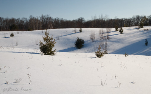 It was a cold day with a temperature of 16 degrees, but the sun was shining brilliantly and beckoned us outside. We packed our snowshoes and went to Hunt Hill Audubon Sanctuary in northwest Wisconsin. The wind was brisk, but if we could snowshoe along the tree line there was a welcome wind break. There was even protection from the wind as we headed across the prairie, and in the valleys of the steep hills we could bask in the sun’s heat. It was late afternoon so the sun threw its shadows across the landscape at a sharp angle. We soaked up the sun and the crisp fresh air of the day and enjoyed the exercise.