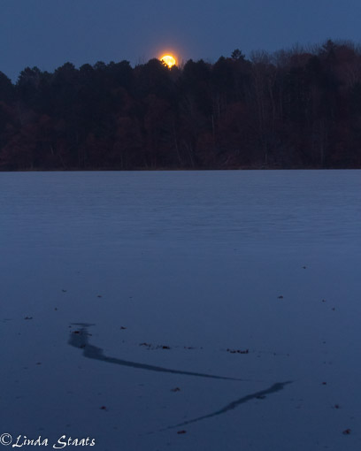 The cold has settled in and the lakes are freezing. Throughout the day I watched the clouds and the snow move in. The wind would pick up and blow the snow down the lake, forming whirlwinds of white skimming the ice. As quickly as the snow came in, then the sun would come out. The ice would creak and moan as the heat from the sun combatted the cold of the ice. There were sub-sonic groans that pierced the air. And then the cycle would repeat – snow then sun then snow. But before sunset the skies cleared and there was a beautiful and quiet full moonrise. It lifted over the opposite shore and trees and eventually directed its light on the snow-covered and ice-cracked lake, littered with leaves now encased in the ice.