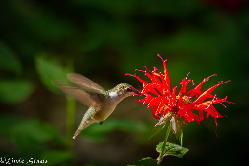 I watched in amazement at this tiny hummingbird as he flitted among the bee balm blossoms in the yard. He would work all around the edges of one flower, fly off to an adjacent flower and do the same, then to another and another. After about a minute he would land on a nearby branch and rest. And then he’d repeat the same thing all over again, sometimes moving to a blooming hosta and then back to the bee balm, or sometimes to a clump of catmint nearby, and retreating back to the bee balm. It was a treat to observe and marvel at something so very small with all this energy.