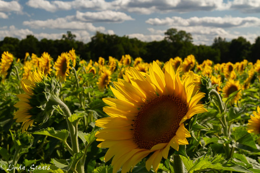 It’s a true summer’s day – blue sky above with white patchy clouds, and the sun is beating down with its warmth. We are driving along some county roads in northern Wisconsin. We’ve passed fields of green soybeans and acres of corn, all thriving in spite of the late planting season and the copious amounts of rain this year. But up ahead is a bright and welcome sight — at an intersection there is a sea of yellow on one side of the road. It stretches off to the trees in the distance, and it is a glorious field of sunflowers. Faces to the east, backlit by the sun, the large blossoms are nodding in the wind. To me this is the epitome of summer, and I’ll soak it in to remember during the not-so-summery days that lie ahead.