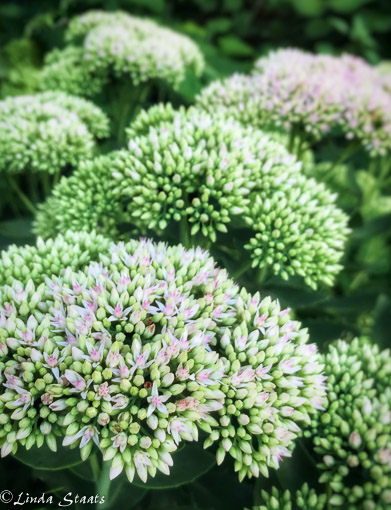 The nights have a bit of coolness to them now, and the sunshine isn’t quite as hot as it was earlier this month. Our daylight is becoming noticeably shorter as we move closer to fall. The skies are filled with Canada geese flying over, strengthening the wings of the young ones as they prepare for migrating south; their honking fills the air. I noticed these sedum blossoms the other day with spots of color in them. They too are responding to the fast approaching change in the seasons.
