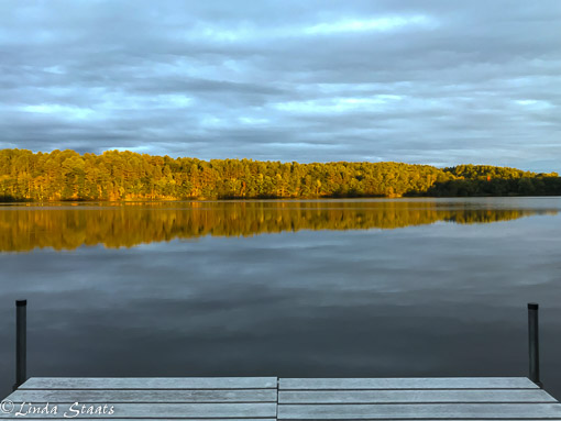 The day was cloudy and gray and the wind had been blowing. Twilight was approaching and yet the sun broke through the clouds for a brief five minutes. It lit up the far shore of the lake and the trees became golden, all reflected in the stillness and calm of the lake. The shadows of the treetops to the west started to darken this eastern shoreline and would eventually envelop the entire view. But for a brief period it was a magical and golden view.