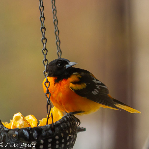 It was a cold and wintry day last Sunday that even included a snowfall. We were inside looking out and not enjoying this winter weather in mid-May. But it seemed to invigorate all the birds in the area as they were coming in and out of the yard, looking for food on the ground and in the feeders. We put some orange slices in a hanging feeder and realized they were a magnet for the birds. This Baltimore oriole became very vigilant in guarding what he saw as “his” oranges. There were a number of Rose-breasted grosbeaks that challenged him, and only occasionally won the challenge. All these birds were a welcome colorful sight on the cold drab day, and a delight to watch.