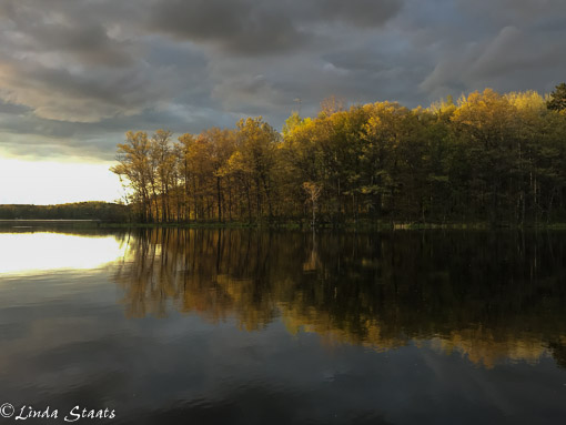 It had been a windy and cloudy day, but as the evening wore on the wind began to die down. We were fishing as the air became still. Eagles were flying overhead and the crappies were biting. The dark clouds were still above but the sun moved below them lighting up the opposite shore. The leaves were full on some of the trees and yet others had only begun to leaf out, filtering the sunlight as it came through the trees. The low light and the calmness created a beautiful reflection of the end of a spring (finally!) day.
