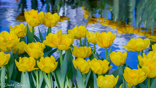 Our landscape has been white for so very long that a bright burst of yellow is a true signal of spring. I spent some time at the McNeely Conservatory where it is spring, under glass. Yellow and red tulips, ranunculus, crocus, and daffodils are wonderful (and needed) reminders of the season of spring. These yellow tulips were set off by the blue reflection of the sky in the water behind them. Soon enough we will have spring outside too, and not need to go inside to experience it.