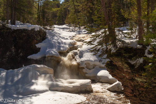 A week ago I spent some time at Amnicon Falls State Park in northern Wisconsin. The snow was especially deep this past winter and it is starting to melt making the rivers full, especially as they near their end. The Amnicon River was used in the mid-1800’s for logging and it eventually flows into Lake Superior. All the snow melt from upstream gets directed over the falls that are in the state park. It was a thundering sound that I heard as I walked next to the Upper Falls. The river is open in some places and in others it flows under snow and ice. The falls aren’t completely open but it won’t be long before the snow and ice are gone. A bit further past the Upper Fall is a lovely walking bridge that crosses the river as it spills over the Lower Falls and eventually to the lake.