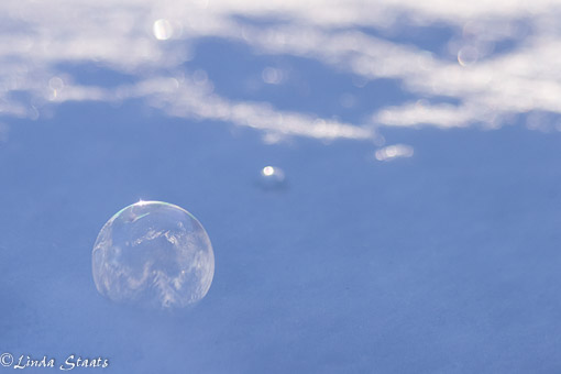 The cold and snow make us pause. We can’t hurry and just do the things we normally do — walking on ice-covered paths takes attention and concentration, and five to ten minutes are the minimum just to bundle up to step out in sub-zero temperatures. But pausing gives us time to observe and to appreciate. This bubble becomes frozen in a near instant, with crystals forming on the inside and refracting the morning light as the sun rises over the new fallen snow. Many other bubbles broke as they landed, too fragile to absorb an impact on the soft snow. And even this bubble was short-lived. The wind picked up and it shattered quickly; how happy I was that it commanded my attention for a short span.