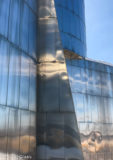 It was another bitterly cold day in the Twin Cities. Suffering from cabin fever from our long drawn-out winter, we were looking for a diversion and headed to the Weisman Art Museum on the campus of the University of Minnesota. The visit was wonderful – a chance to forget about the weather and get absorbed in the art inside. The building itself was designed by Frank Gehry and features his Deconstructivist style architecture. The outside panels are a treat for photographers as they reflect the surroundings. With the cold sunshine there were amazing abstracts, lines, designs, and colors.