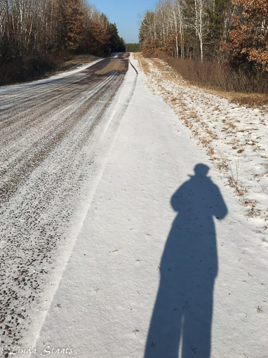 These are the days of long shadows. As we get closer to the winter solstice the sun is lower in the sky as the earth tilts. In Minnesota and Wisconsin we are north of the 45th parallel so “our tilt” seems more noticeable. This photo was taken at noon, but my shadow is nowhere close to being right beneath me as it is in the summer. Instead the sun is only 123 degrees above the horizon, elongating my shadow.