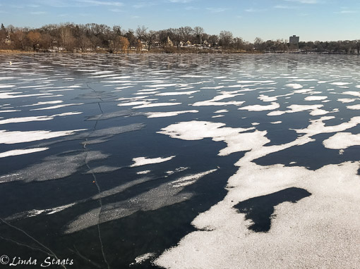 After a week or more with below freezing temperatures, we reveled in a day of 40 degrees and sunshine. I took advantage of our “heat wave” and went for a long walk that took me through Como Park. As I went past the lake it was wonderful to see the snow and ice patterns. The dark areas in the photograph are clear ice, interrupted by the white snow that had been blown across the lake. There were lots of big cracks going through the surface too. Once we get back to our cold temperatures, the ice will continue to form….all a part of winter in Minnesota.