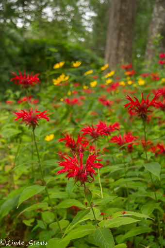 The bee balm is in full bloom right now; its bright deep red petals attracting all sorts of pollinators and other visitors. In full sunshine the blooms take on an iridescent shade, and in gloomy cloudy situations the colors pop out of the otherwise green landscape. I watched the bee balm garden as the butterflies came and went, followed by the hummingbirds. Their activity was tireless, moving from one blossom to the next to the next. Then they would retire to the pine tree as if to rest, and later return back to the blossoms.