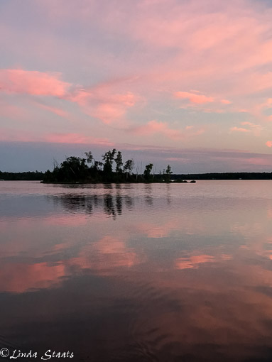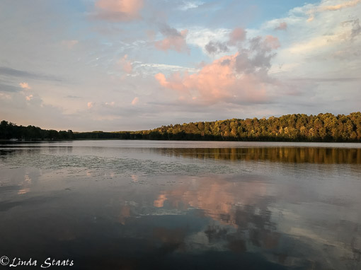 One of the mantras taught to photographers is patience. Sometimes what you are expecting may not appear possible, but a little patience can lead to some grand results. Such was the case earlier this week. The afternoon was cloudy, warm, and humid, and the sky was nondescript. Even the lake looked dull. We headed out for a ride around the lake and 30 minutes before sunset the clouds started to clear. As the sun started to go behind the trees on the western shore, they cast a shadow on the eastern shoreline. The water became calm, and the clearing sky filled with pink and white clouds was reflected in the lake surface below, along with the gold of the trees on the shoreline. It lasted for a few minutes and then was gone; my patience rewarded.