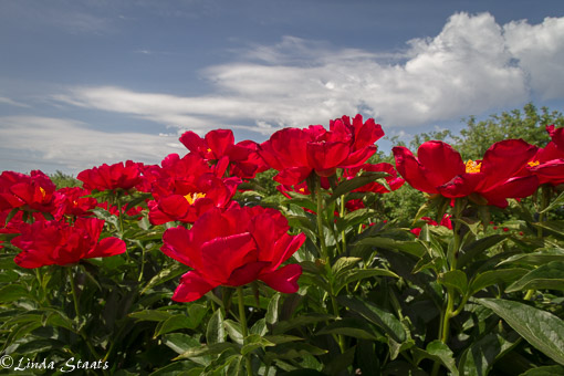 On a brilliant summer’s day we took a drive west of the Twin Cities to Swenson Gardens in Howard Lake, Minnesota. Their gardens were open for their annual Peony Field Days, and the timing was perfect. With warmer temperatures and bright sunshine many of the peonies had come into full bloom. It was a chance to wander and dream and plan for places in our own garden for more of these lovely plants. I especially liked these America peonies – their bright red was a wonderful contract to the green foliage and the blue sky with its puffy clouds.