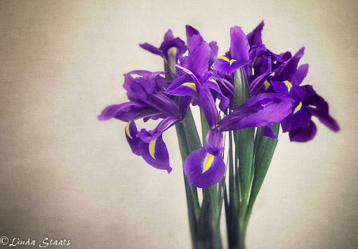 We’re languishing still in winter – short days, colder than normal temperatures, gray skies, brown ground. This beautiful splash of purple iris caught my eye at the store last week. Flowers! Color! Spring! – all in one compact bouquet. It was an instant “shot” of what I needed. The promise of spring is still ahead; yes, there will be blue skies, sunshine, the scents of spring, and the colors of flowers – somewhere ahead of the snow expected later today.