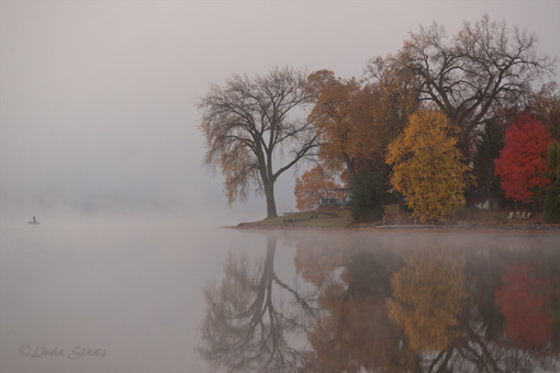 Our fall has continued dry, yet yesterday morning I awoke to a thickness of fog hanging in the air. I grabbed my camera and drove about five miles north to one of our urban lakes. The further north I went the thinner the fog, until I arrived at the lake with blue skies and a beautiful sunrise. I was a bit bummed that I wasn’t getting the fog that I was hoping for, but I continued to photograph the lake and the fall colors. After about 30 minutes the setting changed, and the fog enveloped the far shore, then rolled across the lake from south to north. The atmosphere was just what I was hoping for. As I waited the fisherman moved closer to the point and I made this image. Two minutes later the fog had thickened even more and the fisherman was not visible and the even the reflections were hidden behind the fog. As fleeting and unpredictable as it can be, I love the ethereal and softening effect that fog can give to an image.