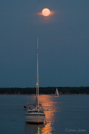 Every two and half years or so we are treated to a blue moon – the second full moon in one month. With relatively clear skies last Friday night we headed to a nearby lake to enjoy a picnic on the shore and watch for the moonrise. We were joined by a large group of children trying their luck fishing as well as a number of people out bicycling or walking – all enjoying the evening. As luck would have it, a bank of low clouds was hovering on the east horizon, and the moon was hardly visible as it first slipped over the lake. But as it continued its rise in the sky it cleared the clouds and shone brightly, reflecting in the water below, and lighting the path for this sailboat as it made its way back to the marina. A beautiful night and a wonderful way to bring a close to the end of August.