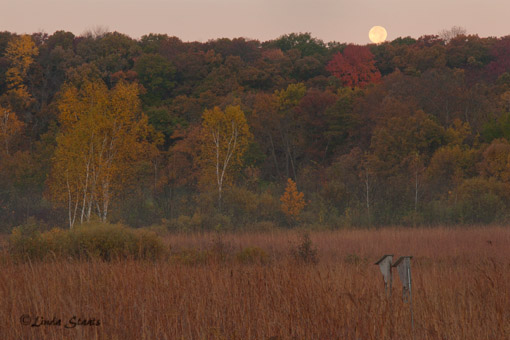 With delightful autumn weather forecast for the day, we headed out before sunrise this morning to Wild River State Park. This Minnesota park is north of the Twin Cities and is located on the St. Croix River. Although there was the promise of afternoon temps in the upper 70’s, the morning had a cool feel to it. We drove down to the canoe landing on the river and could see the fingers of fog stretching into the air and creating a veil over the fall colors on the Wisconsin shoreline. As we turned the opposite direction facing away from the river, we were greeted by the full moon as it was making its way behind the hillside. The prairie stretched out before us filled with golden grasses; the birdhouses were empty at this early time of the morning. The hillside was brilliant with the colors of fall – golds, oranges, reds – all in a hush before the sunlight brought them out into a blaze of bright color. Silently we watched the moon descend behind the hill and turned our attentions back to the river, accompanied by the geese and the ducks that were flying by.