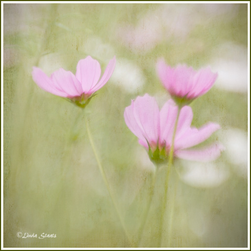 Almost as if a switch had been thrown, our weather changed from excessive summer heat to below normal temperatures. With lows in the 50’s at night and highs only in the 60’s and 70’s we had a real hint of the end of summer. Life has sped up knowing that fall can’t be far away, and although we may have hot temperatures again during the daytime, the nights will cool off considerably as our hours of daylight shorten. Knowing this made these beautiful pink cosmos seem even more special when I found them in a wonderful garden today. Their lightness was a reminder of the carefree feeling of summer – enjoy it now because it’s fleeting, soon to be followed by the deeper smells and rich colors of autumn.