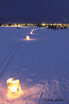 Valentine’s Day on frozen Lake Superior — what a great way to celebrate a winter’s evening! Chequamegon Bay is at the southwest corner of Lake Superior, surrounded by the towns of Ashland and Washburn, Wisconsin. For the past 13 years the residents of the area come together to celebrate the cold of winter with a ski and snowshoe race across the frozen bay — the Book across the Bay. This event is unique in that it begins at 6:30pm, and the course is lit by hundreds of frozen luminaries marking the route along the ice. The event draws over 2,000 participants skiing, snowshoeing, and hiking. This year’s route was changed at the last minute because of four days of warm temperatures and a big thaw. The snow that had covered the frozen lake became liquid, then froze again into a huge sheet of ice. The race organizers changed the course to a loop and spent hours “churning” the ice to lay a path that provided some traction for skiers and walkers. Their hard work paid off and it was a beautiful event, accompanied by light snowflakes. After crossing the finish line there was a huge bonfire to warm up at and a post-race party in a giant heated tent. Hay was scattered on the frozen ground and hay bales were stacked around the perimeter. Everyone was treated to a hot chili feed, delicious local beer, and dancing to a great live band. It’s a party of the best kind, and a delightful way to enjoy and appreciate our winter weather and scenery.