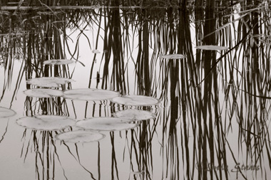 With a weekend full of activities that already included an art exhibit reception, a 40-mile bike ride, and a baseball game, we decided to head out early this morning for some peace and quiet on a local lake. We had hoped to be on the lake as the sun was rising, but Mother Nature had other plans and the dawn began overcast and cloudy. As we launched our canoe we had the entire lake to ourselves, surrounded by the special stillness and quiet that is reserved for the earliest times of the morning. The lake was calm and we paddled near a shoreline that was lined with cattails and had lily pads floating nearby. As I looked at the lake surface and the reflection I felt like I was looking at a sheet of music with staff lines and notes placed in a pattern that was meant to be played and interpreted. Perhaps it was a prelude to the day that was just beginning — a time of wonder and calm when all the world seems still and all you have to do for the next hour or so is relax in your canoe, paddle on the lake, and enjoy the hours as they quietly develop.