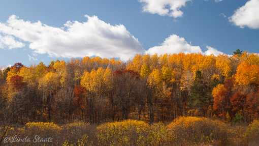 Images like this one help me to remember the beauty that we enjoyed for what seemed such a short time this year — the deep golds and yellows, the burgundys and browns of the oak trees, and the blue of the sky with the billowing clouds. I can look at this scene and remember the warmth of the sun and the smell of fall.