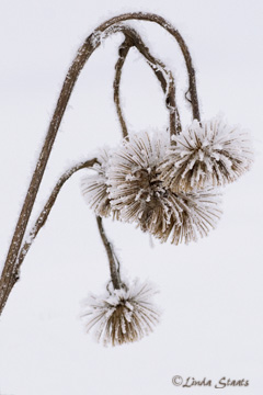 Just when I think I’ve gotten tired of the cold and the snow, Mother Nature puts a new spin on winter. Yesterday morning I woke up to a beautiful scene. The fog that had crept in during the overnight was freezing and coating everything with a wondrous layer of white. Within a mile from the house I found these lovely flower heads that had been leftover from summer. On any other day I would have walked right past them. But with a frosting of frozen fog and their delicate arching, I became mesmerized and photographed for over a half-hour. It was as if each small snowflake was layered ever so gently, one on top of another. And yet this was all short-lived, as within a matter of hours the sun broke through the clouds and the wind picked up, eliminating any remnants of this morning scene.