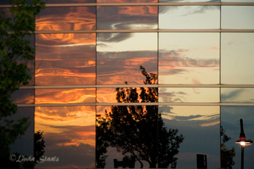 For the past week we’ve been treated to some spectacular sunsets. Part of this has been due to residual smoke from fires burning in Canada that has swept into Minnesota, and part has been due to the weather conditions here. The other night while we were out enjoying an ice cream cone, I noticed that the western sky was setting up for what looked like a great sunset. I scurried home to get my camera, then headed out to find a choice spot with a great foreground to make my photographic image of the setting sun. As would happen, the conditions were changing rapidly. I pulled into the parking lot of a commercial building that overlooks the interstate; mind you, not the “choice” spot for a great image. But although what I saw looking to the west was not photogenic, what I saw as a reflection in the building behind me caught my eye. With the curves in the glass and its separate panels, the sunset took on a look that reminded me of Van Gogh’s “Starry Night.” The colors of the sky seemed to swirl about in the reflection, yet were anchored by the lamp and its post. So although I didn’t find what I was expecting, I was delighted at what was presented to me by chance.