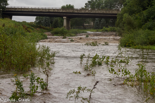 We wandered south of the Twin Cities yesterday on a dreary, rainy Saturday. August has been unusually wet with heavy downpours occurring frequently, resulting in high rivers and standing water in many fields. All this was noticeable as we drove through the countryside, but it became more apparent on a stop in the town of Cannon Falls. Here, the Little Cannon River flows alongside and through the town. In a “normal” August, average rainfall for Cannon Falls is four inches. To date this month they have had close to double that – almost eight inches. And with yesterday’s rain continuing to fall, it was obvious as the river stretched out of its banks. The falls were roaring and tossing the brown, sediment-filled water into the air as it tumbled toward the Cannon River which then flows on to the Mississippi River.