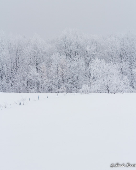 But last Saturday morning the landscape came to life in another way. The gray day dawned with the color white everywhere, placed on shapes and forms. The cold morning with the moisture in the air caused the fog to freeze, coating the trees and fence wires. In a drab landscape there was an amazing brightness. The lack of a blue and sparkling sky allowed the snow to reflect the gray above, muting the contrast between the black tree trunks and the frozen frosting. Jack Frost had conspired with Mother Nature to give us a beautiful landscape