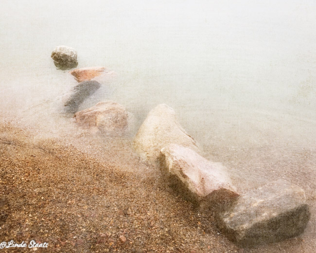 On our return to Minnesota we stayed one night at Lake Shetek State Park in the southwestern part of the state. As we explored the park and lake we walked across a causeway connecting the lake shoreline to Loon Island. The causeway was constructed as part of a WPA program. Earlier in the day I had seen a family swimming and relaxing at the end of the causeway. But as I walked again in the calm of late evening my attention was drawn to these rocks that extended from the sandy beach into the lake. Their pattern seemed to be welcoming me back to the land of 10,000 lakes and asking me to come along, follow each one, into the coolness of the lake.
