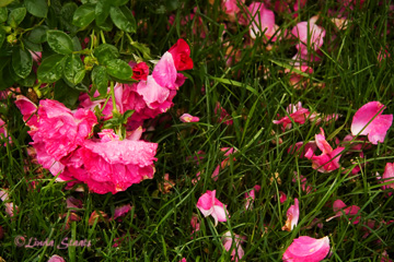 We’ve had a couple of days of constant and sometimes heavy rainfall. Although it’s wonderful for the lawns it’s also pelted some of the flowers. We have a beautiful John Cabot climbing rose in the backyard that has been full of blooms. With the weight of the rain it has pulled some of the canes so far forward that the blooms have been touching the lawn. Those blooms that were past their prime have been knocked down and have created a carpet of petals on the lawn under the bush. At first I wanted to clean up all the petals, and yet upon a closer look I realized that they were truly quite lovely as they lay scattered about. Sometimes the “untidiness” of nature has lessons for us all to learn.