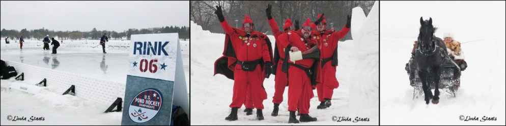 In the bracing cold of winter, we Minnesotans can not be said to shy away from outdoor activities! And yet Mother Nature has played a cruel trick on us here in the Twin Cities this year. In what is traditionally the coldest time of the season we have had temperatures above freezing, and rain…requiring some adjustments on our activities. This was the weekend of the US Pond Hockey tournament on Lake Nokomis. Unfortunately the rinks were covered with 2 to 3 inches of water, making a puck useless, and postponing the presentation of the Golden Shovel award to a later date. This was also the beginning of our Winter Carnival in Saint Paul — an annual celebration of the enjoyment of our white season. The Vulcans were out en force, celebrating in their raucous tradition, and getting ready for their overthrow of King Boreas in the upcoming week. And there was a sleigh and cutter rally at Lake Phalen, where the horses and ponies were tromping through slush and standing water, rather than gliding along over inches and feet of snow. But we know that winter is not done yet. There are predictions of colder temps returning again. In the meantime, we’ll promise to enjoy the winter, adjust to Mother Nature’s schedule, and revel in whatever is doled out to us.