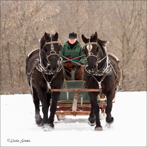 The Saint Paul Winter Carnival is in full swing this weekend. This is the time when we celebrate (and embrace) the cold weather. There are events ranging from parades to ice carving to snow sculpting to hockey games to outdoor beer gardens to Red Bull Crashed Ice and a sleigh and cutter rally too. Although we’ve had some serious cold weather this past week our snowfall has been minimal. But there was enough for the sleighs and horses to be out today. With temperatures right around freezing and a light snow coming down it seemed like I had been transported to a different era. Many of the drivers were dressed in period clothing to match their sleighs or wagons, and the horses seemed to enjoy the open space and the snow as they trotted along. There were one and two-horse sleighs, and a few sleighs pulled by ponies whose feet had to work overtime to cover the same distance as the horses. This driver and his matched team seemed to be reveling in the event and the weather. The image made me think that they had been out for a drive and were now headed back to the comfort and warmth of their respective home and barn.