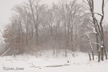 Our winter landscape has been blanketed in white since early December, and each week a bit more snow has been added to the ground. I headed out for a snowshoe walk early yesterday morning at the golf course on the University of Minnesota Saint Paul campus. The city was quiet for a Saturday morning — no commuter traffic, no snowplows clearing the roads yet, and most people were still in their beds. As I got into the center of the golf course I realized that it really wasn’t as quiet as I had thought. There were birds flitting from tree to tree chirping their greetings, and tracks in the snow where the squirrels had scampered from one area to another. And then I noticed that the landscape wasn’t really quite so white. Although the gray sky was reflecting in the snow cover, the oak trees still had their reddish-brown leaves clinging to the branches, some of the blonde grasses were blowing lightly in the breeze, and the pine trees were green with a coating of snow. The landscape was a study of muted contrasts and colors.