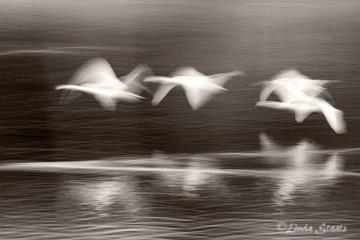 During the winter months in Minnesota many of our rivers and lakes freeze. But there is a section of the Mississippi River that runs through the city of Monticello where the waters remain open because of a nuclear generating plant that operates upstream. From mid-November through February, this area is home to over 1,500 trumpeter swans. Because the swans weigh between 20-35 pounds each they need a large area to take off and land. During a recent visit to Monticello, I spent a wonderful few hours along an open stretch of the river observing and photographing the swans as they came and went. Not only was this a visual treat, but an auditory one as well. The swans’ wings make a distinctive sound as they’re preparing to take off in flight. This sound, along with their honking and the sounds of the Canada geese and ducks that were also in the area made for a wonderful cacophony that filled the cold morning air. This is not your documentary photograph, but I chose a slow shutter speed to better convey the flight of the swans; their grace and beauty was reflected in the river below them as they flew past me and upstream.